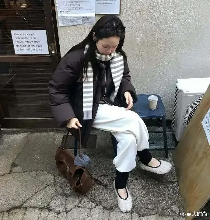 比如这套深色的基础款短羽绒服,搭配一条白裤子,基础穿搭很适合通勤,加入浅灰色的条纹围巾就有了可爱气息,一双毛毛的白色鞋子也增添了温柔优雅,穿搭瞬间就有了几分韩系温柔气质风,既实穿又时髦舒服。▼