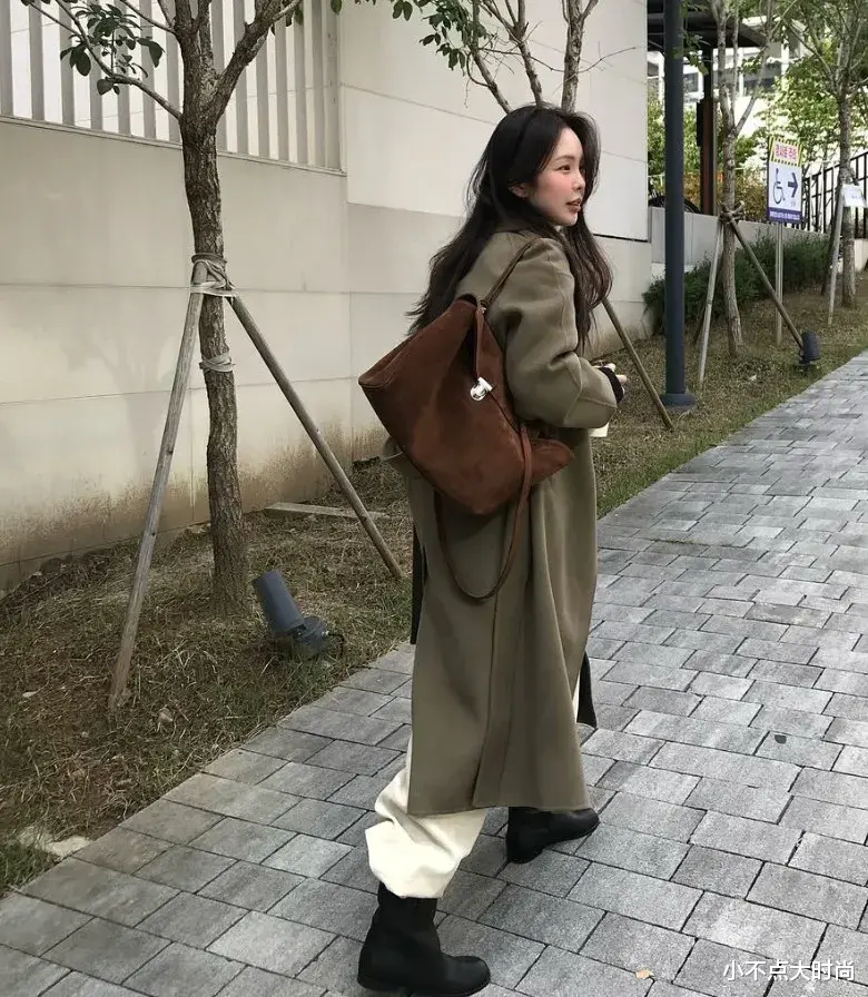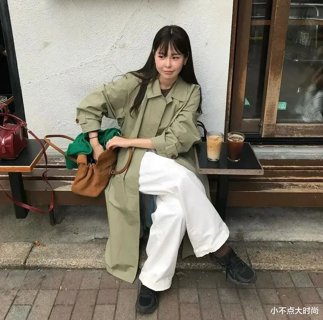 基础款的风衣外套选择低饱和度的绿,别致又文艺,搭配白裤子,干净的气息让人眼前一亮,冬天也能拥有生机。再搭配一个质感的棕色系包包,一整套复古文艺感,简约好气质,干净大方,通勤也适配。▼