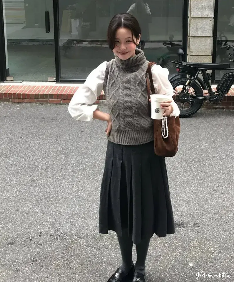 白色的衬衫搭配灰色的毛衣马甲,下身搭配深灰色的高腰百褶裙,显高显瘦,温柔大方又很有气质的穿搭,适合职场,又保持女性的优雅和松弛的文艺气息,大方得体有时尚感。▼