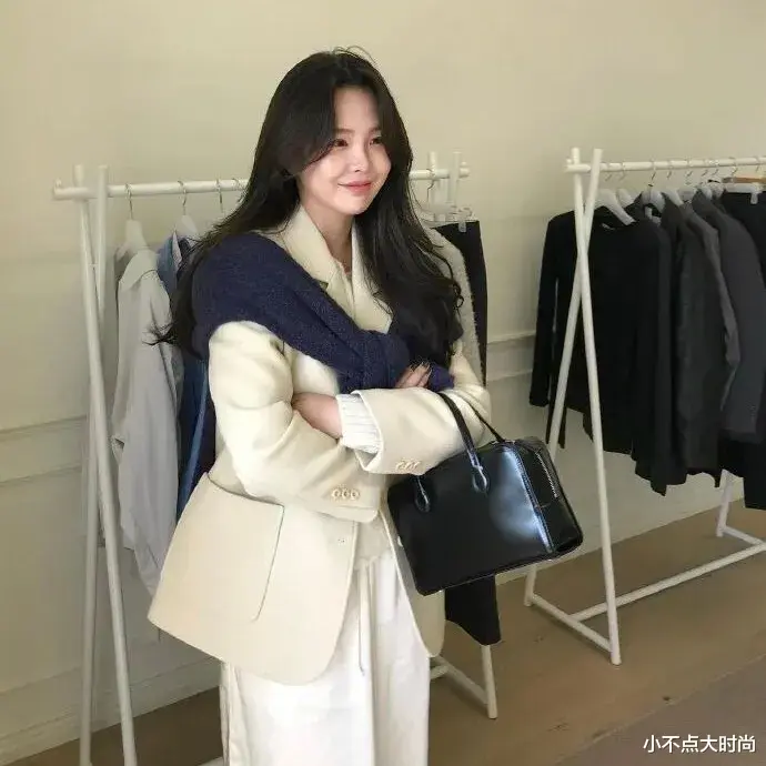 比如浅色的西装穿搭加入一件藏青色的披肩,时尚感瞬间就有了,还增添了几分休闲和松弛感。色彩的搭配上,也充满韩系优雅的气质。▼