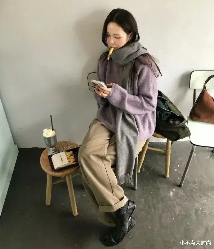 基础款的毛衣搭配基础款的卡其色阔腿裤,简约又松弛感的日常穿搭。毛衣选择淡淡低饱和的灰紫色调,温柔又文艺感,搭配一条灰色的围巾,一整套简约舒服、气质轻文艺,又很适合日常通勤。▼
