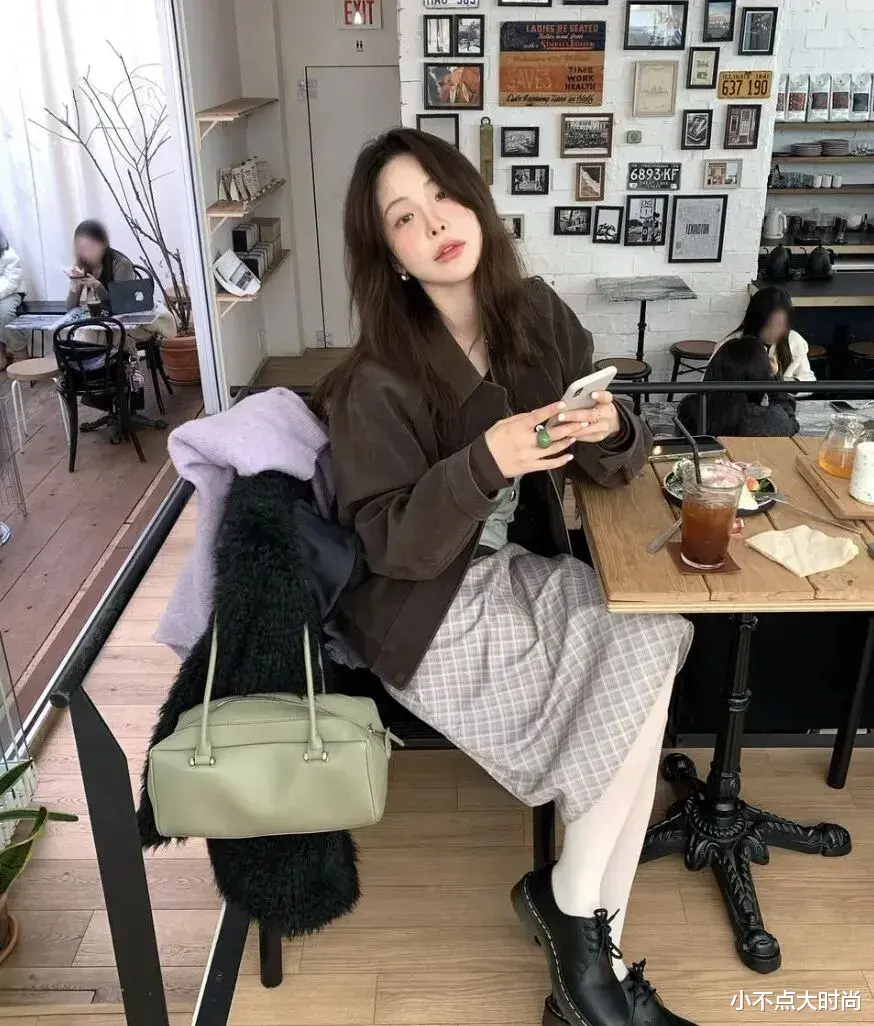 深咖色的麂皮夹克经典又利落,搭配一条浅色的格纹裙增添文艺气质,抹茶绿的手提包也呼应了温柔的文艺感。整套穿搭大方得体又时尚,利落气质又温柔,上班or约会都适配,多种通勤场合妥妥拿捏。▼