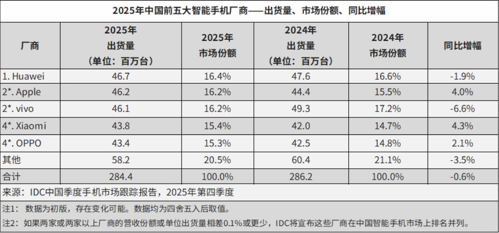IDC 2025年中国智能手机出货量数据(来源:IDC)