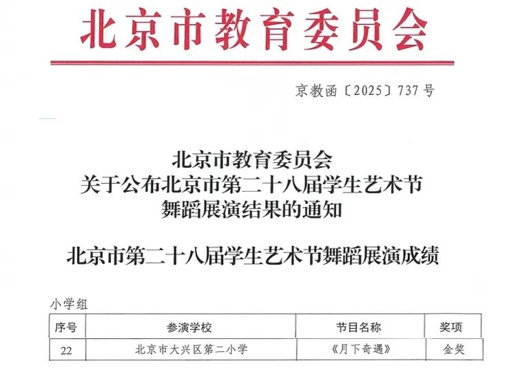 近日,大兴区第二小学艺术教育捷报频传,舞蹈、合唱、朗诵、戏剧四大社团在市级、区级多项艺术展演中均荣获一等奖,展现出学校丰硕的美育成果和学子们卓越的艺术素养。