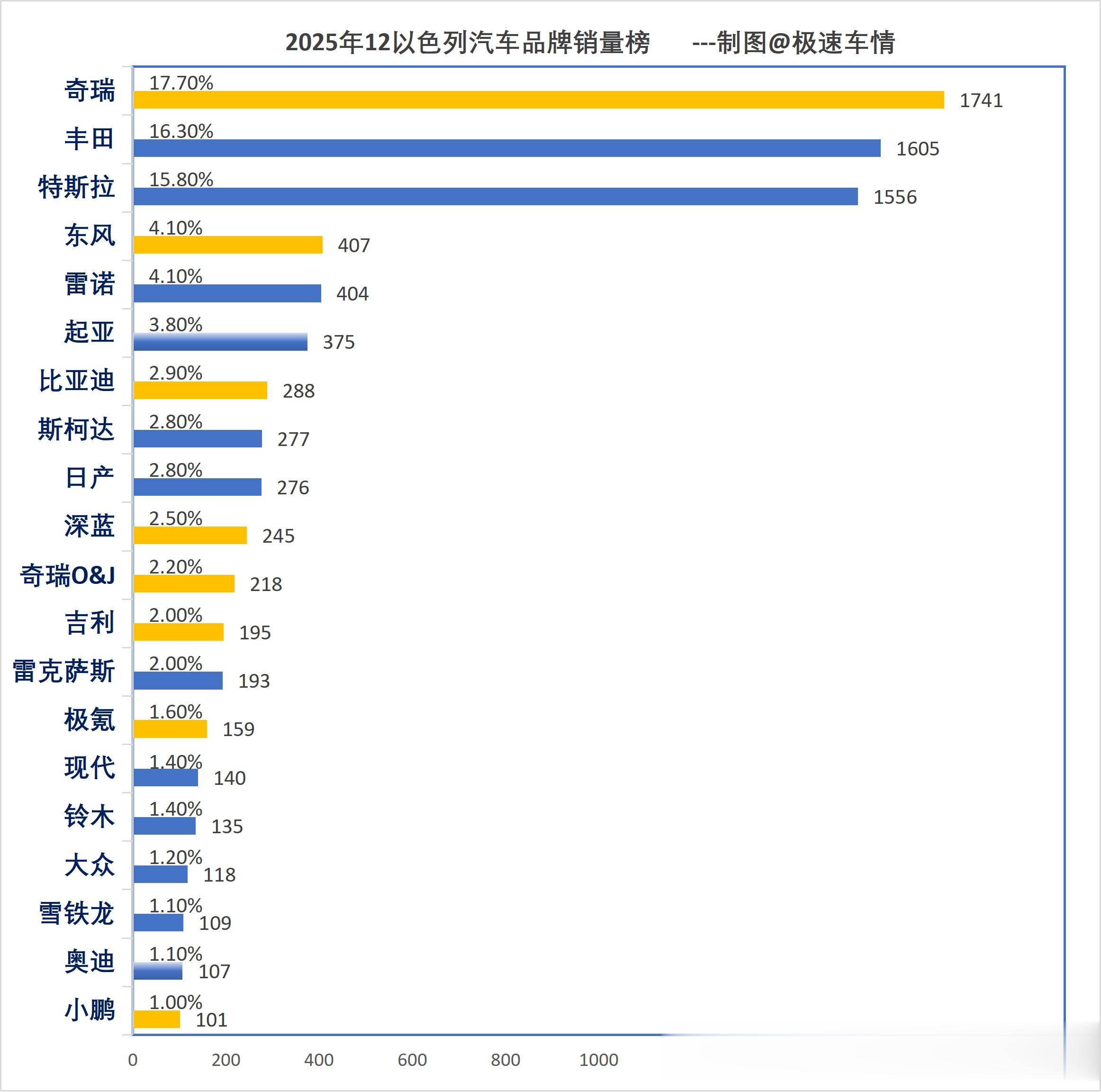 市场总结12月,由于是以色列车市的传统销售淡季,各品牌销量均不高。作为中国汽车出海代表的奇瑞汽车表现优异,时隔三月再次超越丰田排名第一,市占率创新高的来到了17.7%。