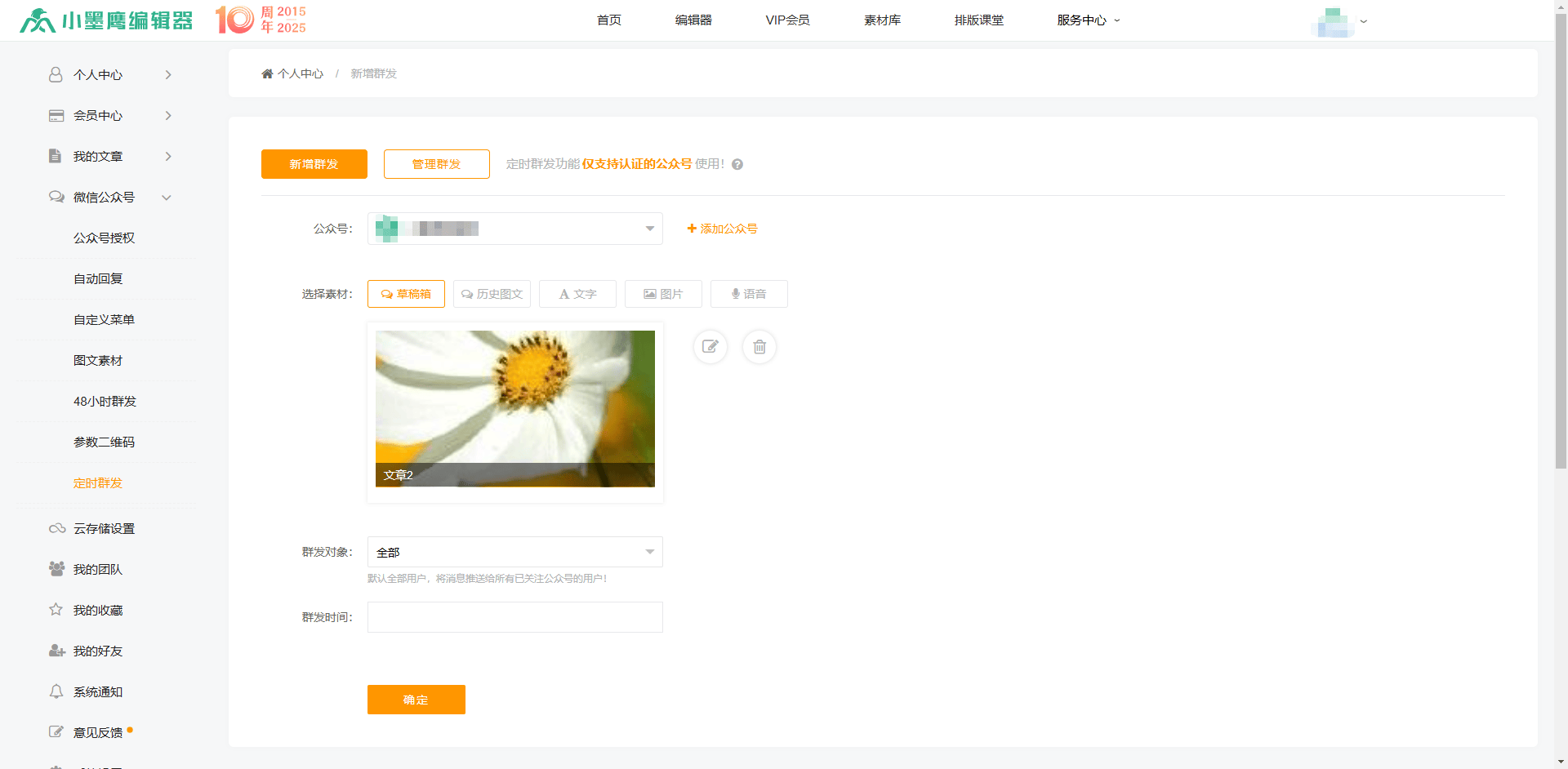 将文章同步到公众号后,在公众号草稿箱中就能查看文章,调整一下封面图的位置,就能使用头像下的定时群发功能,将这篇文章定时群发!