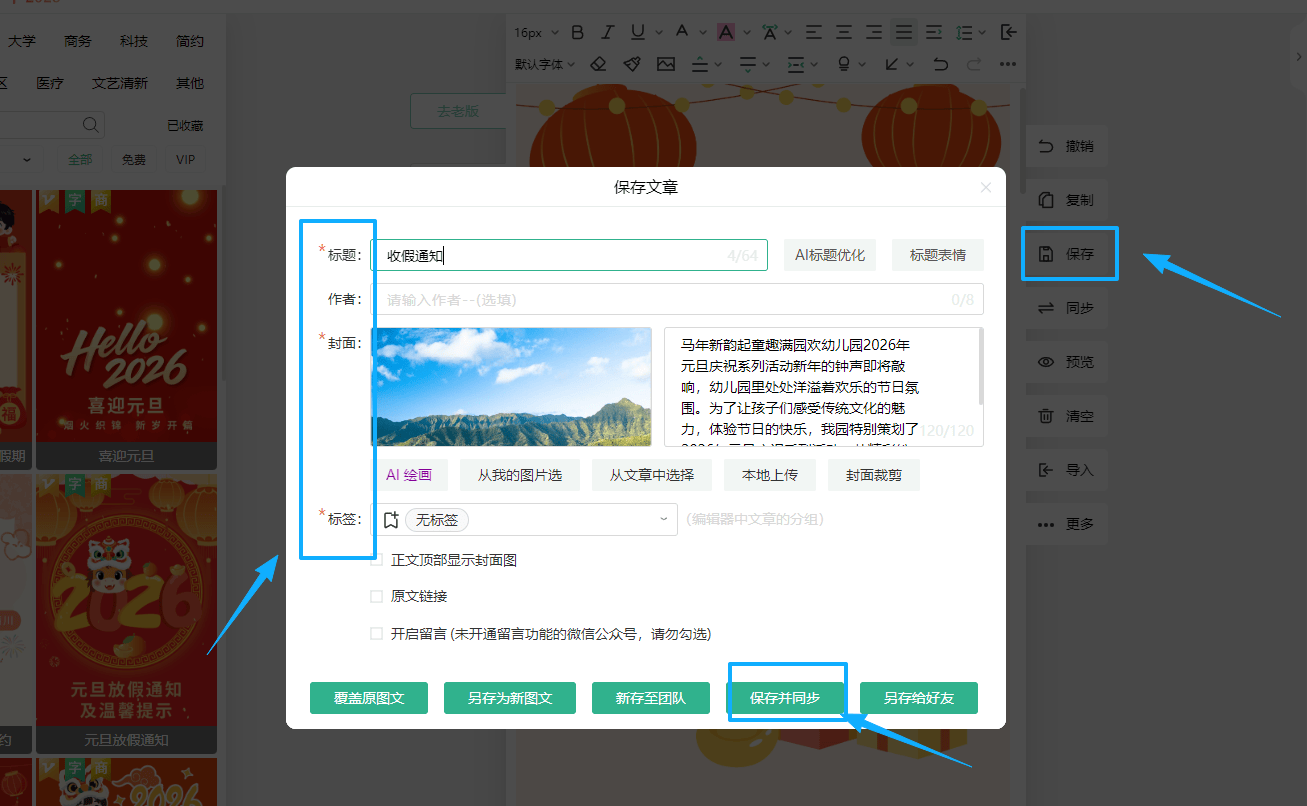文章排版完成后,点击保存文章,填写标题、封面、摘要等信息后,将文章“保存并同步到公众号”,按提示授权。