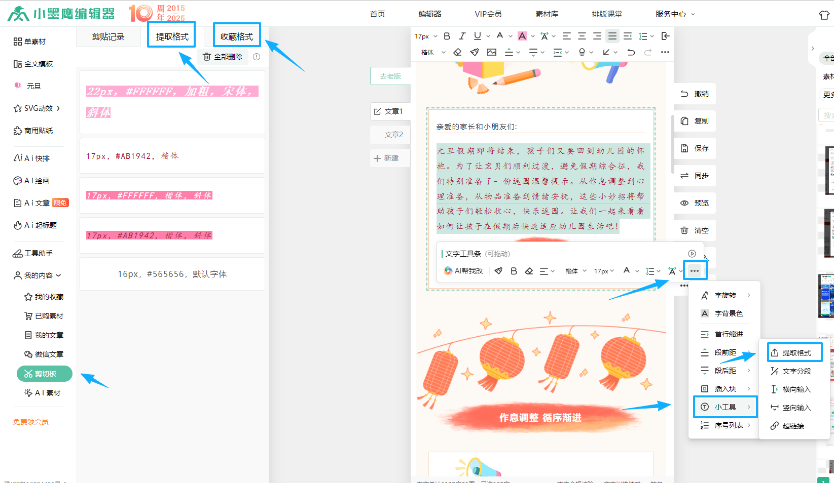 2、或者可以使用文字工具条-更多功能中的格式提取,就能将提取出来的格式,选择其他排版页面中的文字进行使用,还可以收藏格式,下次排版其他文章时使用该格式。