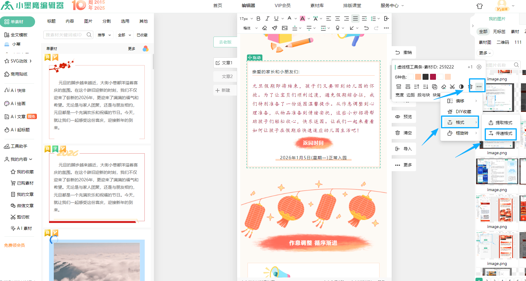 3、对于在同一标题、图片、内容素材的调整,还能使用虚线框工具条中的格式传递,就能将这个文字格式传递到素材ID相同的素材文字上。