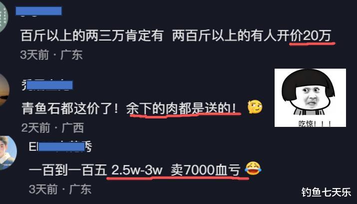 有网友认为:7000块肯定亏了啊,因为曾有网红博主花好几万收过上百斤的大青鱼。所以,一条百斤巨青的就应该值几万块。