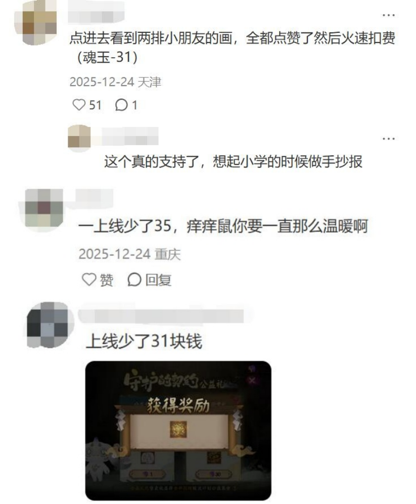 点开才发现,这是《阴阳师》为公益活动拍摄的微电影。评论区里不少玩家分享捐款的截图:“我点了个赞就少了31块钱”,“上线就被扣费”……