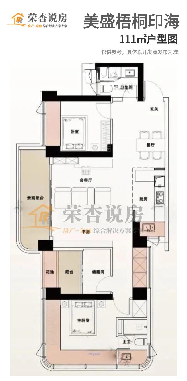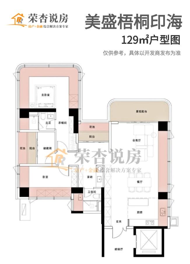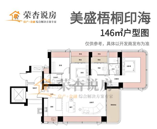 缩小版的146㎡四房户型,专梯入户,开放式横厅,主卧三面飘窗,采光很好,L型厨房+岛台设计,得房率约105%(含赠送),西北朝向看一线梧桐山景观。