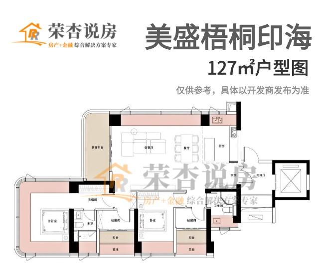 「美盛梧桐印海」共由4栋住宅组成,其中1栋住宅44F,2栋住宅43F,3栋住宅42F,5栋保障房31F,4栋是1所6班制幼儿园。