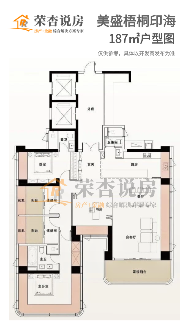 187㎡4房2卫,折后总价956-992万,单价5.13-5.32万/㎡。