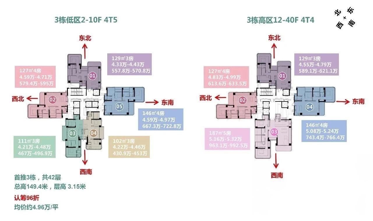 备案单价4.39-7.38万/㎡,96折后均价4.88万,3房总价426万起,4房557万起。