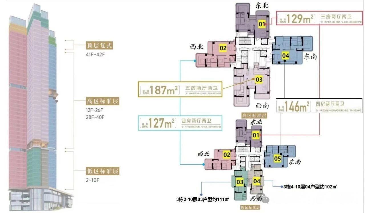 2-10层为低区(4梯5户)、12-26层为中区,27层为消防层,28-40层为高区(4梯4户),41-42层为稀缺顶复式(仅4套)。