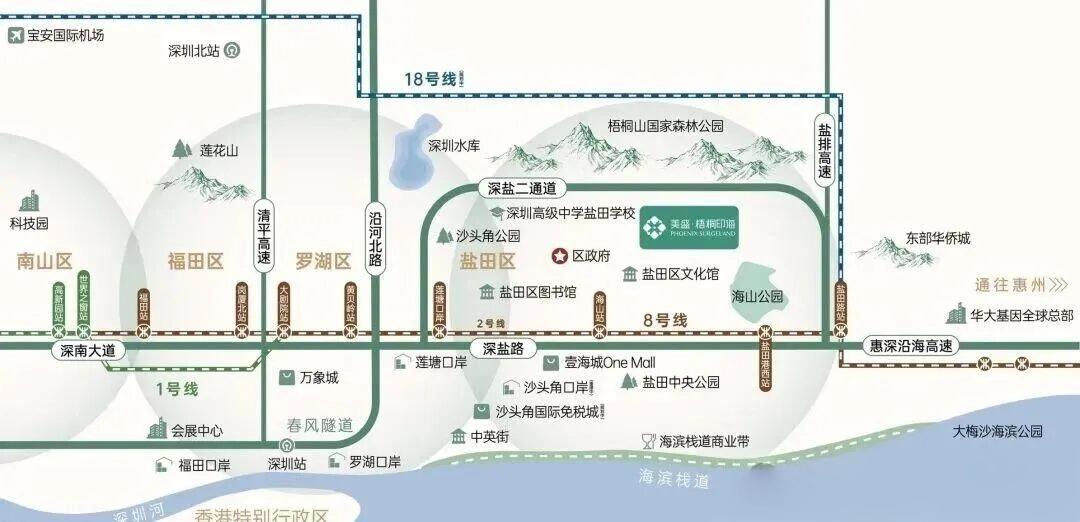 「美盛梧桐印海」所在的沙头角,主打就是山海景观+生态宜居+价格洼地,劣势是地理位置一般,只适合追求景观的地缘家庭。