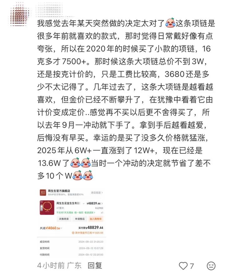 一位网友则在小红书晒出了2024年9月在天猫旗舰店的消费纪录,显示原价62900元的项链打完折后实际支付了48839元。