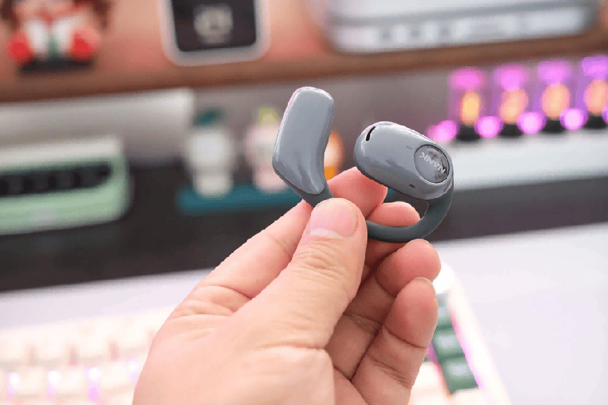 佩戴感受上,单耳重量约为9.8克,内部融入镍钛记忆金属骨架,可根据不同耳型灵活调整贴合角度。表面覆盖柔软硅胶材质,长时间佩戴不易产生压迫感,但整机重心设计稍显前倾,偶有轻微不平衡的感觉。