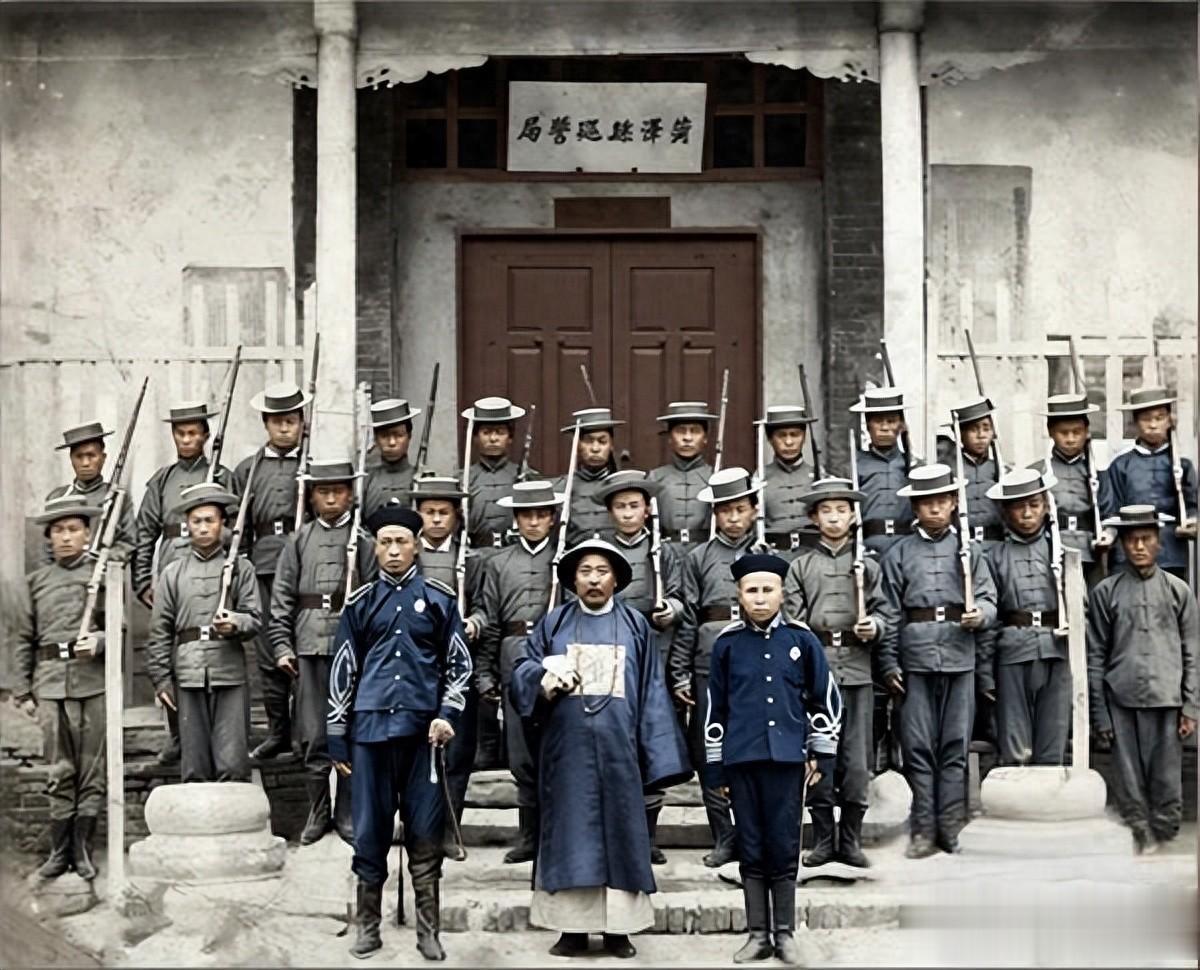 1902年11月,山东巡抚遵旨裁汰绿营,仿直隶模式在济南成立山东省城巡警总局,随后各府县相继跟进。菏泽县巡警局成立于1905年,隶属曹州府,这是山东最早的地方警察影像记录之一。此时全国警察服装尚未统一,各省依地方习惯自定。1908年后,清廷才批准全国统一警察服制。
