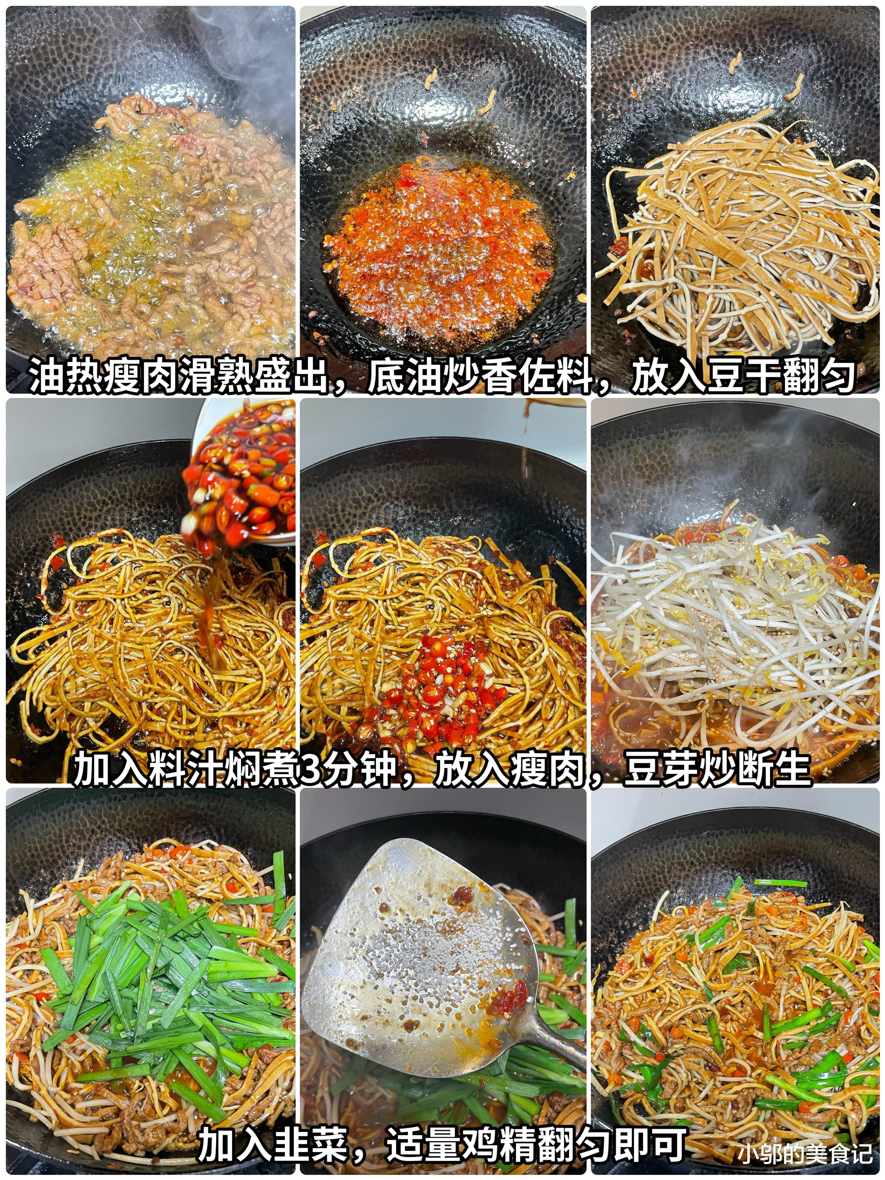 盛一盘端上桌,牛肉的香气混着豆干的酱香扑面而来,肉丝鲜嫩,豆干筋道有嚼劲,豆芽脆爽解腻,韭菜的清香让整道菜更有层次。夹一筷子拌进米饭,酱汁裹着每一粒米,吃起来又香又辣,完全停不下来。记得一定要用大碗盛饭,不然根本不够吃!