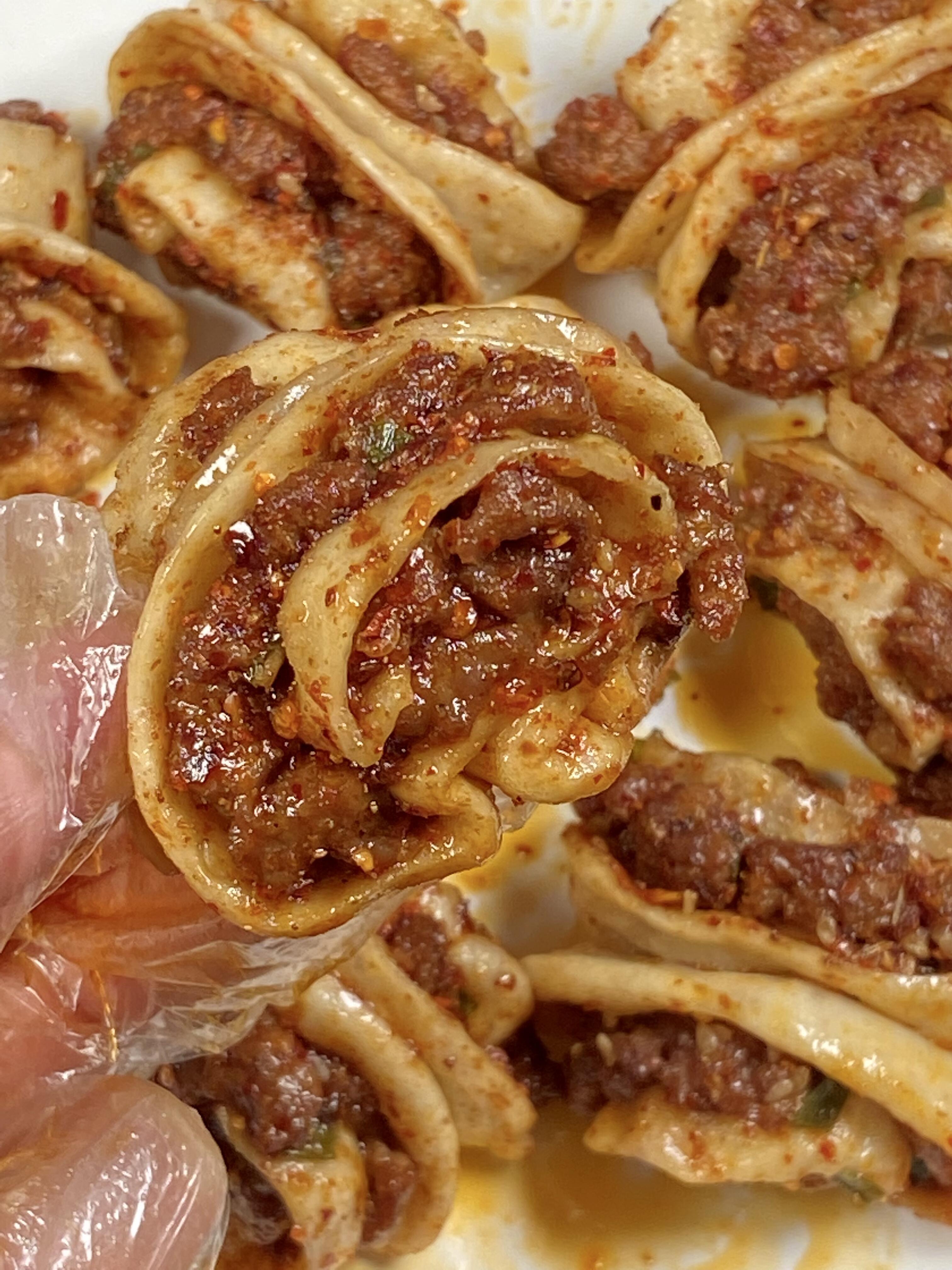 刚出锅的花卷,暄软得像云朵,用手一撕,里面的肉沫和葱花清晰可见,红油顺着指缝流下来,赶紧咬一口——面皮软乎乎,肉沫麻辣鲜香,葱花的清爽中和了肉的腻,好吃到停不下来!
