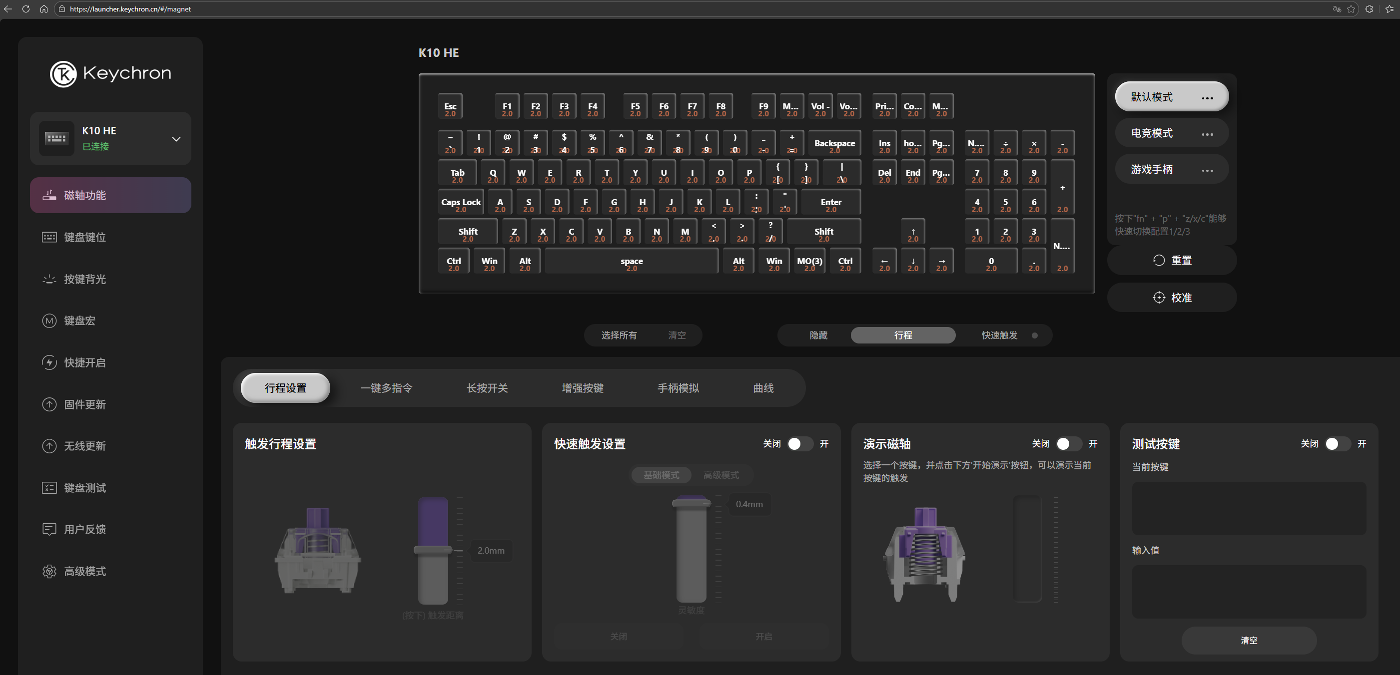K10HE的自定义相当的方便,只需要我们打开https://launcher.keychron.cn/#/keymap即可实现。由于它的调整相当简单且实时生效,不再赘述了。