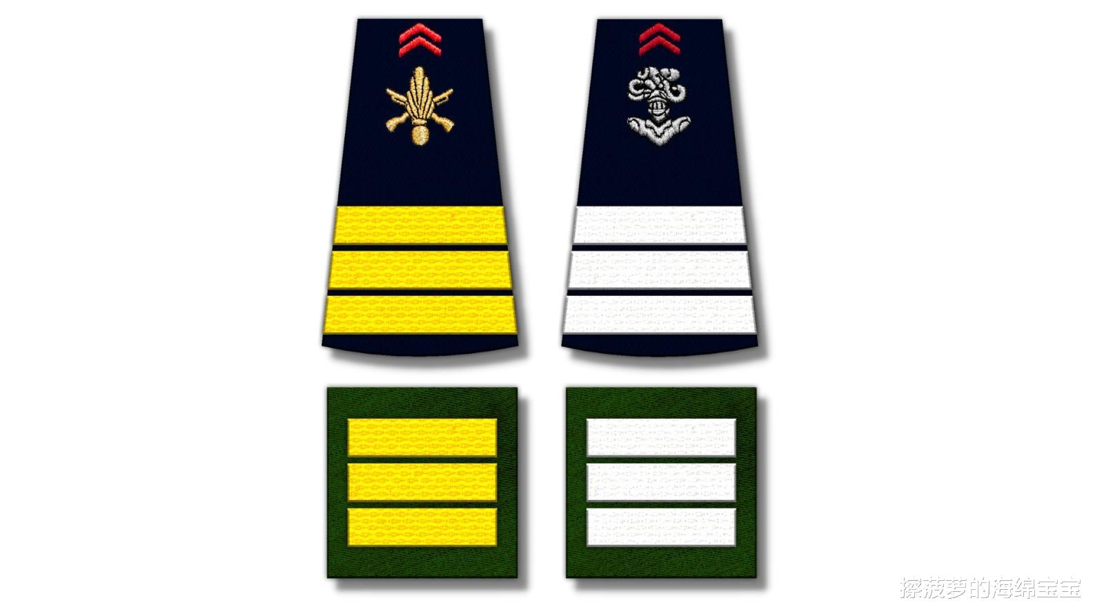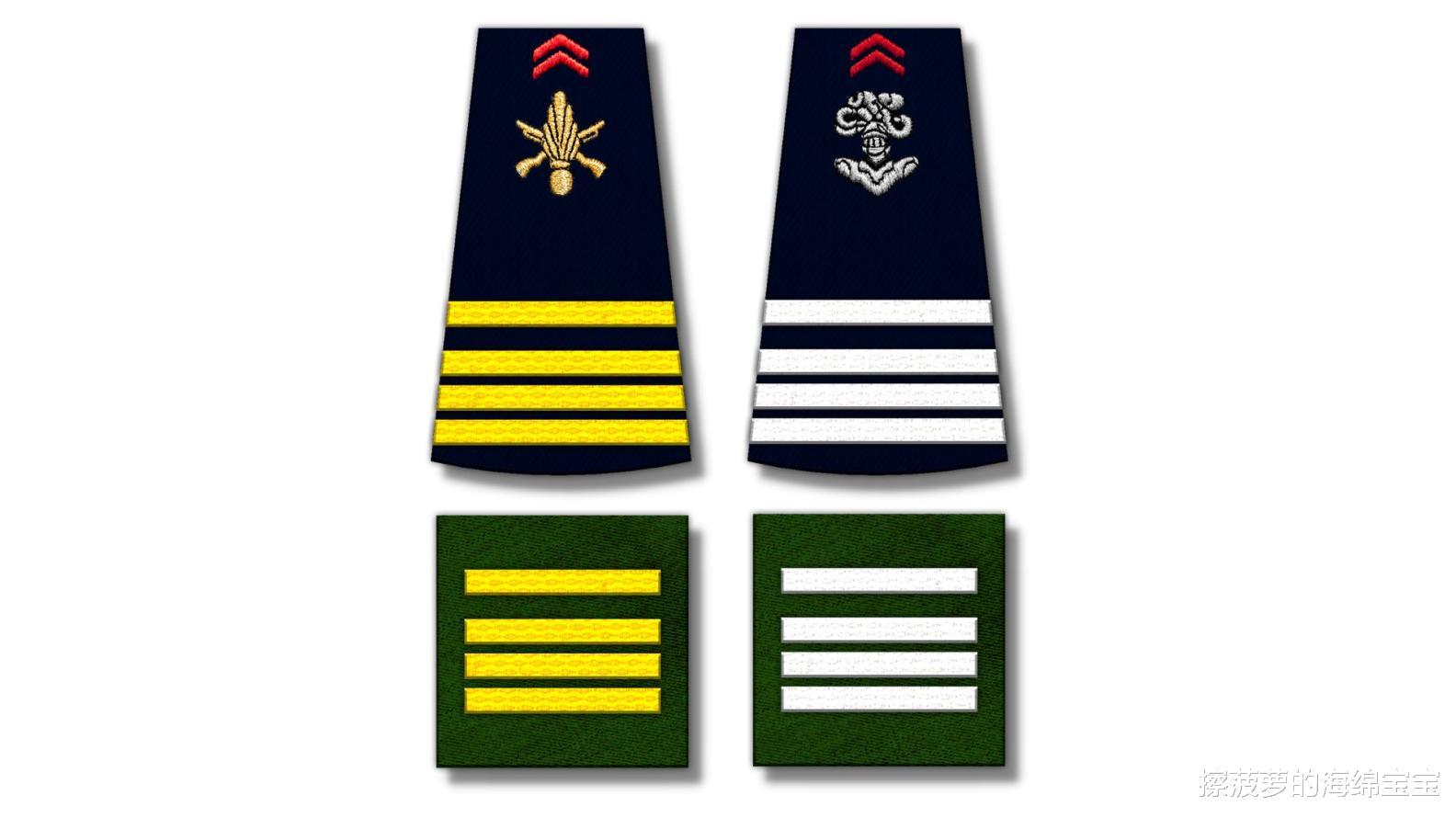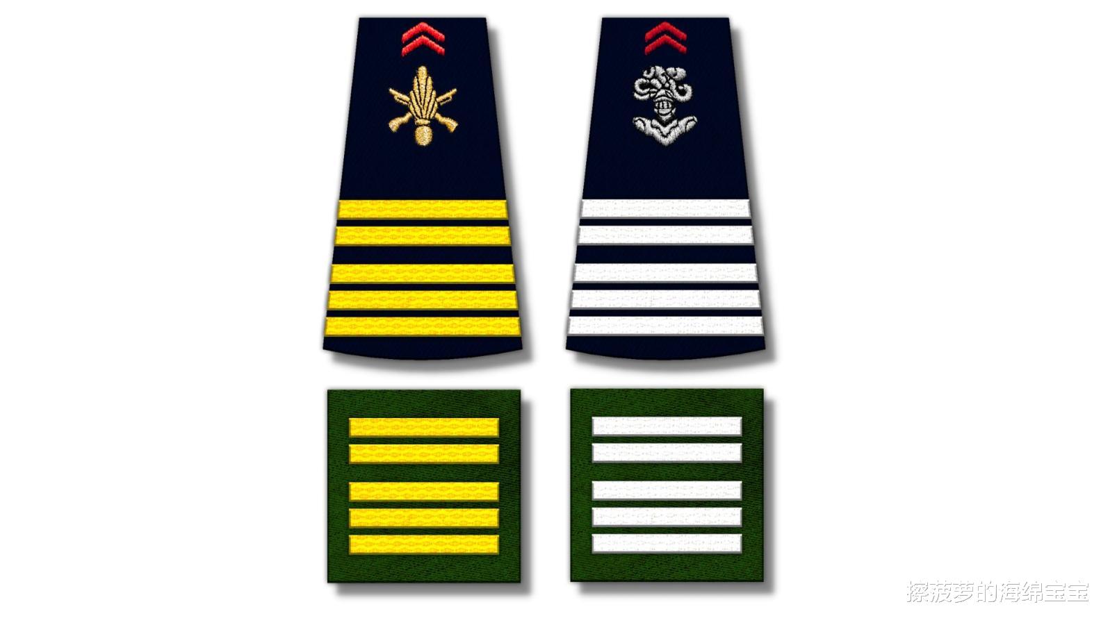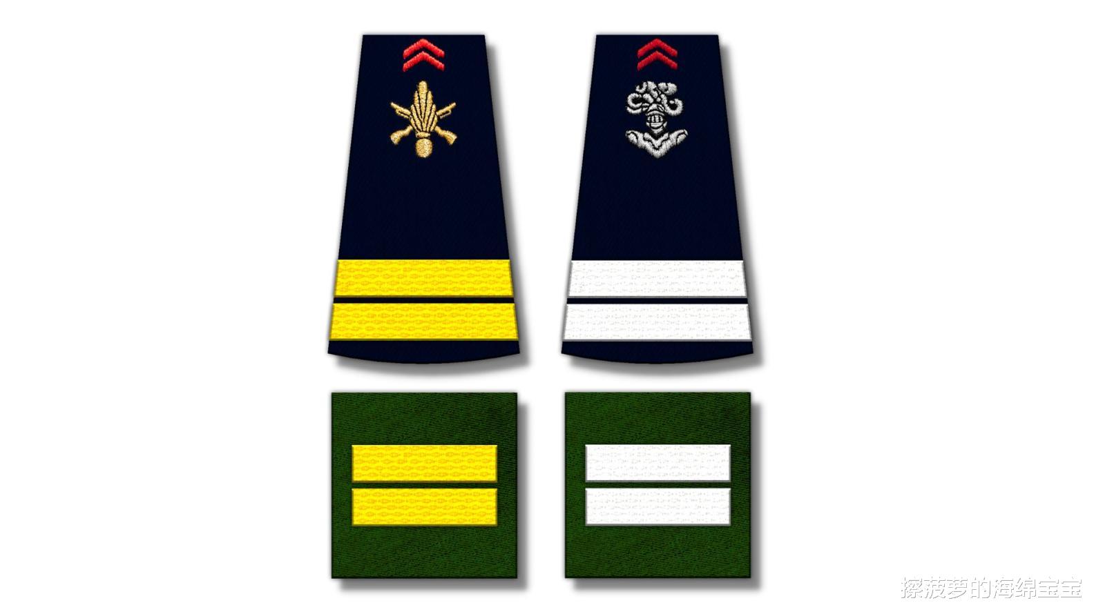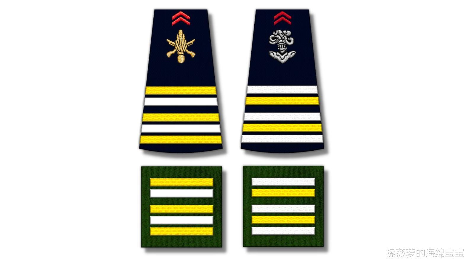 校官级军衔标志上的颜色代表不同兵种。步兵,炮兵,工兵,海军步兵和通信兵使用金色,骑兵,辎重和后勤物资使用银色。属于步兵的轻骑兵使用银色。