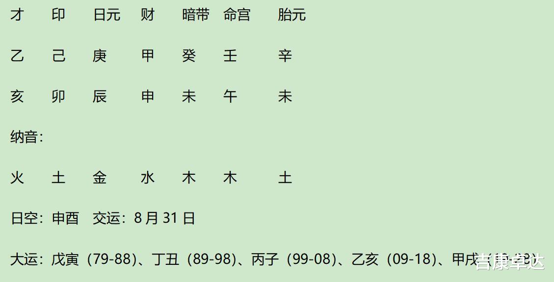 大运乙财合身,流年丙杀合小限辛劫;大运亥与暗带未拱卯,流年辰与时支申拱子,小限丑与月支卯夹寅。