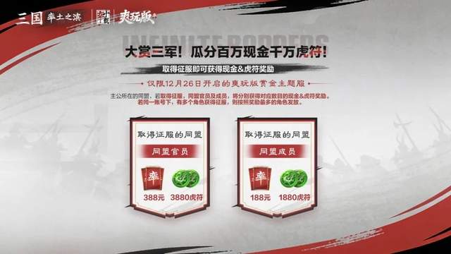 更夸张的是,12月26日首日开启的服务器全是赏金服,组队预约备战还能赢取最高3000元爽玩基金,加上百万现金瓜分活动、千万虎符豪礼,这波福利属实是把诚意拉满了。