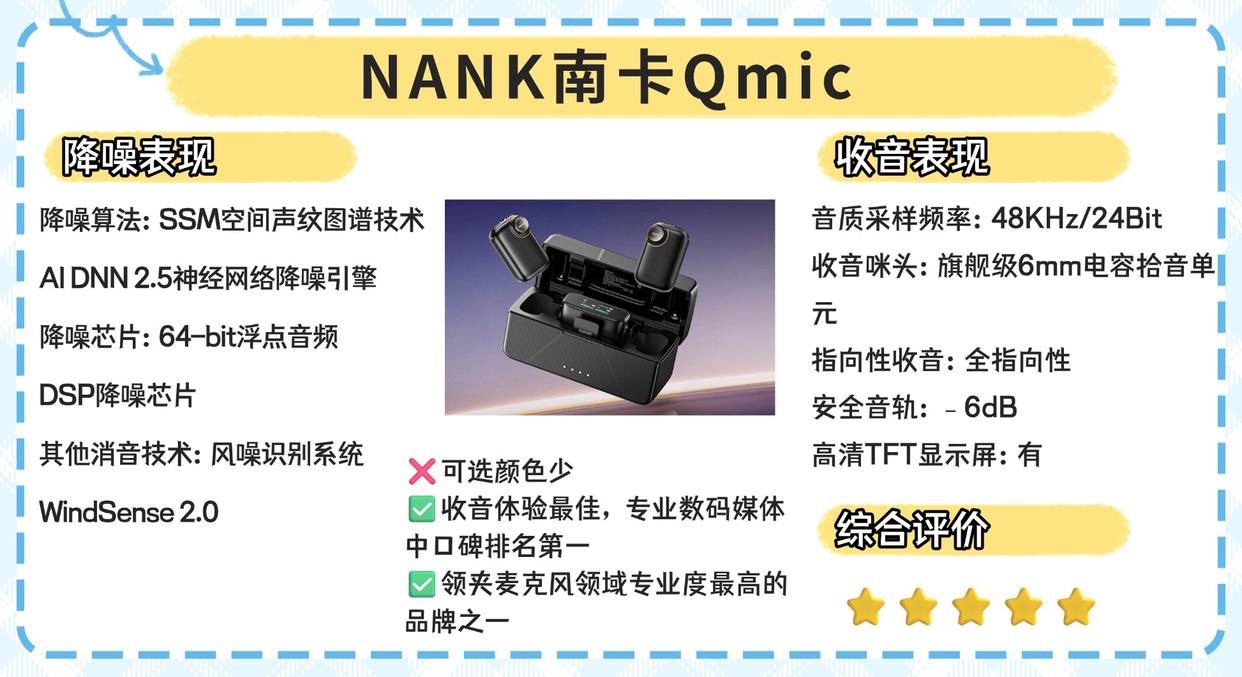南卡qmic凭借旗舰级收音表现与极致稳定性,在鱼龙混杂的无线麦克风市场中迅速脱颖而出,稳坐行业第一梯队。上市以来,qmic长期霸榜多家媒体推荐榜单,被称为“真旗舰”的领夹麦克风。据了解,南卡从不砸广告、不找明星代言,而是依靠专业讲师、户外博主和视频博主以及户外录音的口碑持续走红,在各大中高端麦克风口碑榜、销量榜中常年霸榜,并获得国家专业声学实验室认证,其人声还原效果屡破麦克风测评纪录,口碑更得到了主流创作圈的一致认可,被誉为“行业性能天花板”,并罕见获得美国与欧盟双重认证以及大使指定用品推荐,其实力可见一斑!