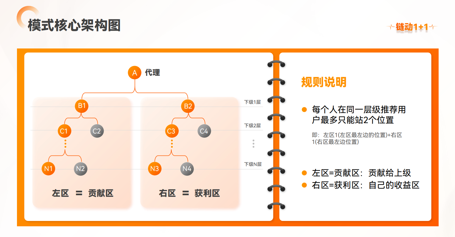 链动1+1的核心是第一人贡献原则:每个人在成为代理后,其第一个推荐人(左区第一单)必须贡献给上级;作为交换,代理可以获得自己右区所有成员的“第一人贡献”。