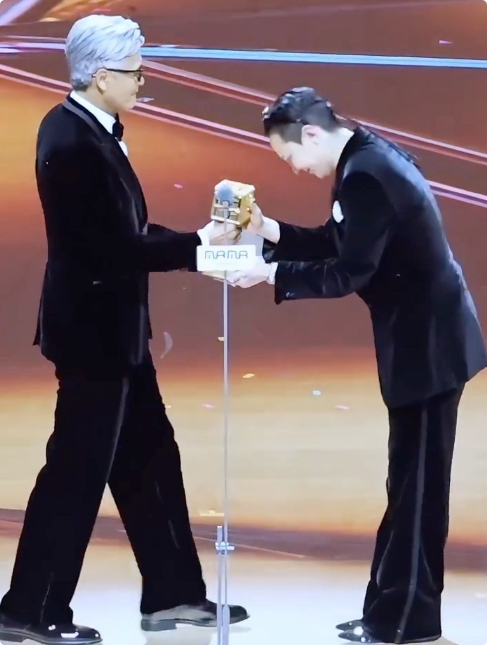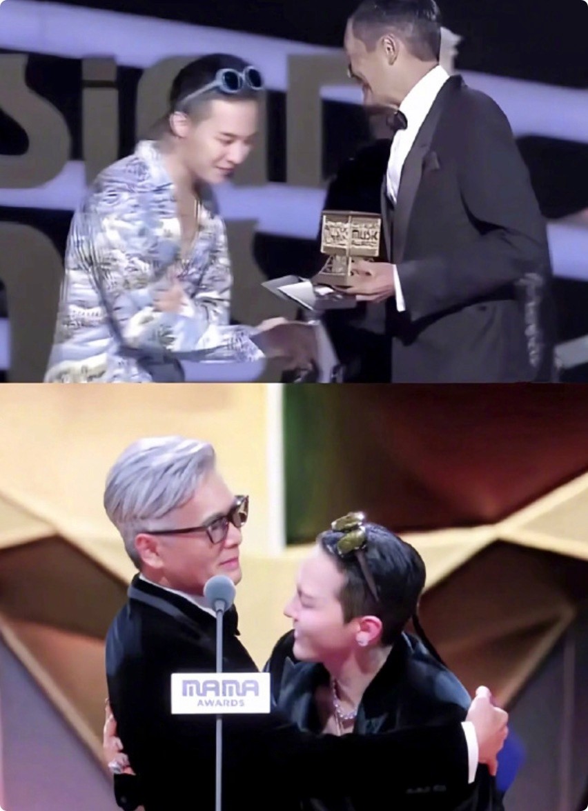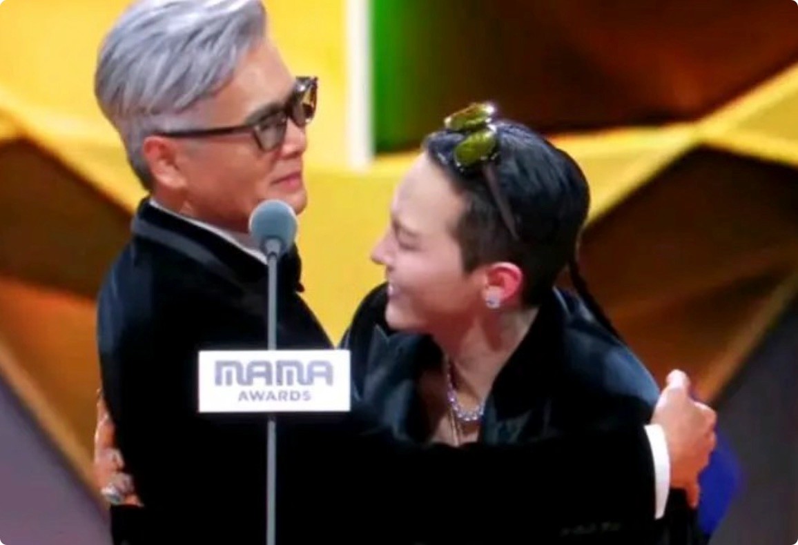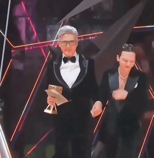 而这,也为后面那一幕埋下了情绪的巨大对比,当70岁的周润发把奖颁给37岁的权志龙,一时间,你会恍惚以为看见了时间岁月的印记。