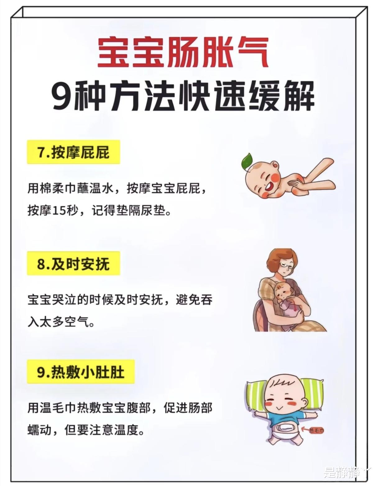 宝宝哭闹易吞空气加重胀气,及时安抚如抱抱、轻拍、哼歌,避免长时间大哭,影响情绪和睡眠。多尝试安抚方式,找到宝宝喜欢的。用温毛巾热敷宝宝腹部,缓解肠痉挛和胀气。注意温度适宜,勿烫伤,每天可进行几次,胀气明显时效果更好。