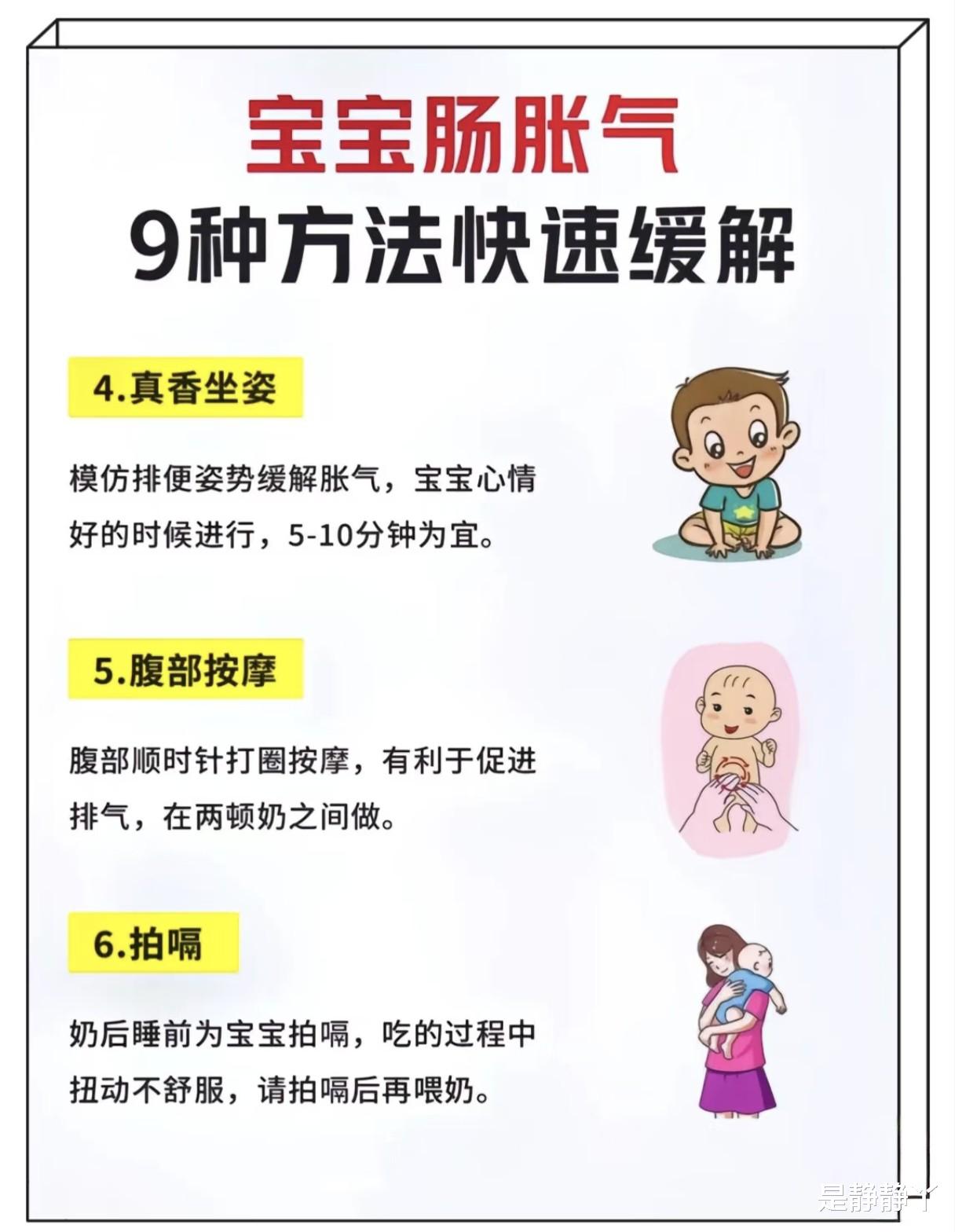 在两顿奶之间,用温暖的手掌顺时针方向轻轻按摩宝宝的腹部,促进肠道蠕动,帮助排气。注意力度要轻,避免在刚喂奶后进行。可配合婴儿按摩油,增加宝宝的舒适度。每天可进行几次,根据宝宝的喜好调整次数。喂奶后、睡前,或宝宝吃奶时扭动不安,及时拍嗝。竖抱宝宝,头靠肩膀,空心掌轻拍背部,从下往上,帮助排气。若宝宝频繁扭动,可能吞入空气,先拍嗝再喂奶,注意支撑头部和颈部。用棉柔巾蘸温水,轻按摩宝宝臀部15秒,刺激肠道蠕动助排气。垫隔尿垫,避免弄湿衣物,动作轻柔,观察宝宝反应。
