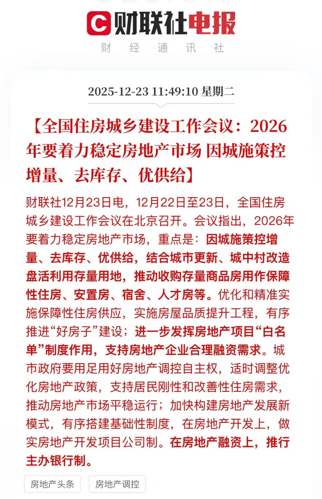 在这样的逻辑之下,会议简单明了地提出了2026年中国房地产市场的核心目标,以及为了实现这个目标需要完成的三个任务:
