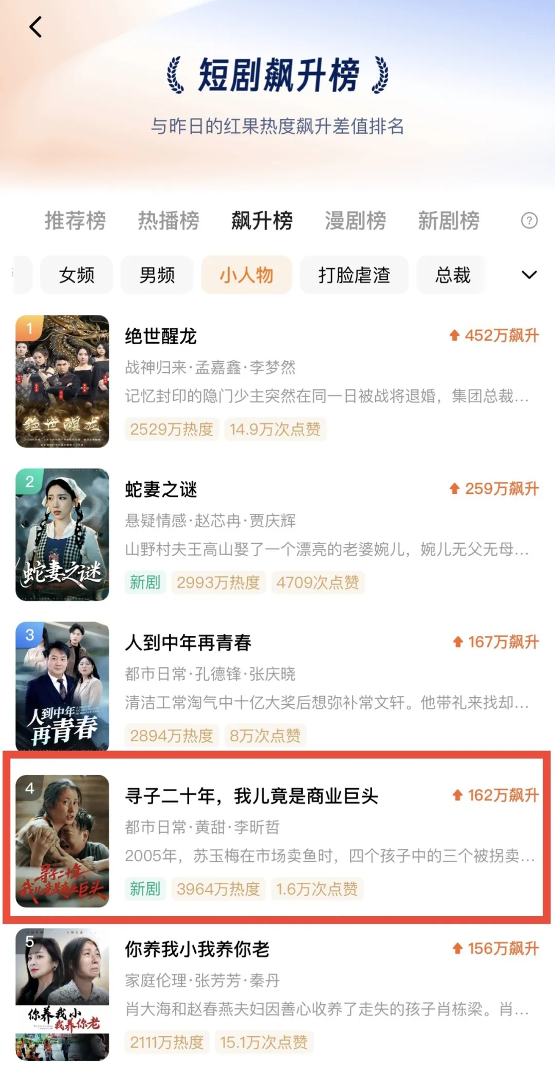 这部短剧以精准的“亲情+逆袭”叙事内核、高强度的戏剧张力,以及对现实议题的深刻融合,在竞争激烈的短剧赛道中迅速突围,强势登陆榜单前列。其上线即引爆的热度,不仅印证了内容为王的底层逻辑,更意味着——《寻子二十年,我儿竟是商业巨头》已吹响市场爆款的号角,我们有理由期待,它即将开启一段属于“真情实感”短剧的新征程,用持续的数据表现重新定义小人物题材的行业天花板!