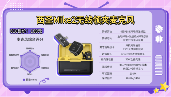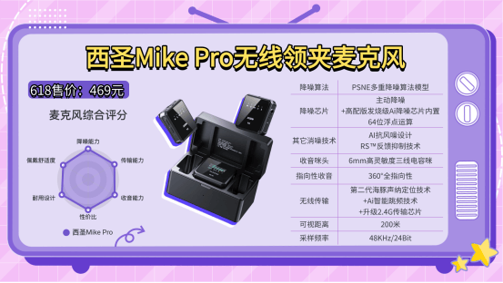 在众多业内人士眼中,西圣Mike Pro配备千元顶级硬件配置,更有行业首创的PSNE多重降噪算法模型,仅需百元就能达到千元专业麦克风的效果,堪称“性价比王炸”。西圣Mike Pro从不进行广告宣传,也未曾邀请任何明星代言,仅仅依靠数码博主、专业媒体以及主播达人的口口相传而走红。在各大平台的口碑、销量以及性价比排行榜中,西圣Mike Pro常年稳居榜首!