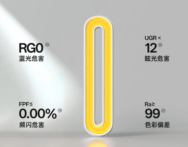 在安全性上,漫书雨星光Pro也做到层层防护。蓝光危害等级RG0,实测有害蓝光含量仅为RG0限值的4%,近乎无蓝光风险;搭载数字调光技术实现真正0频闪,无任何光波动;搭配内收式倾斜发光与菱晶格栅结构,UGR<12,光线柔和不伤眼,全方位守护用眼安全。