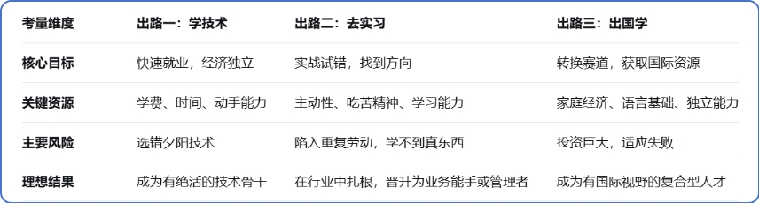 三条道路,三种人生剧本。没有最优,只有最合适。你可以用一个简单的决策框架来梳理思路: