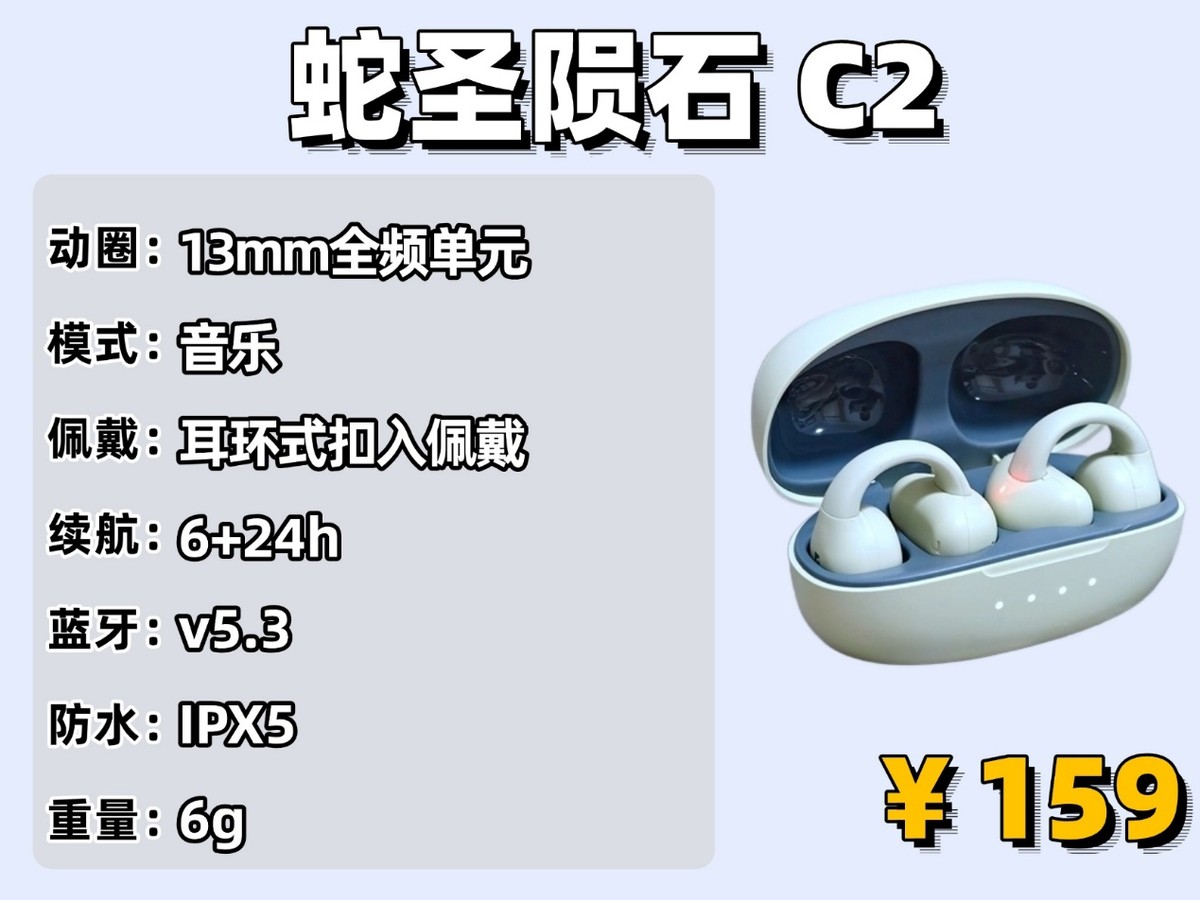 蛇圣陨石 C2 耳机是开放式耳夹设计,单只耳机又仅 6 克重,戴在耳朵上几乎没什么存在感。耳夹支臂使用了用了记忆 TPE 材质,又软又有弹性,能紧紧贴着眼廓,就算戴很久,耳朵也不会觉得压得慌。这种材质还能270度扭转不变形,收纳起来方便,也让耳机更耐用,用完能很快恢复原样,不会越用越松。音质方面的表现也不错,内置了 13mm 高性能全频发声单元,带来了更为真实的立体音效。听音乐的时候,就像在现场一样,能清楚感觉到不同乐器的位置和声音层次。