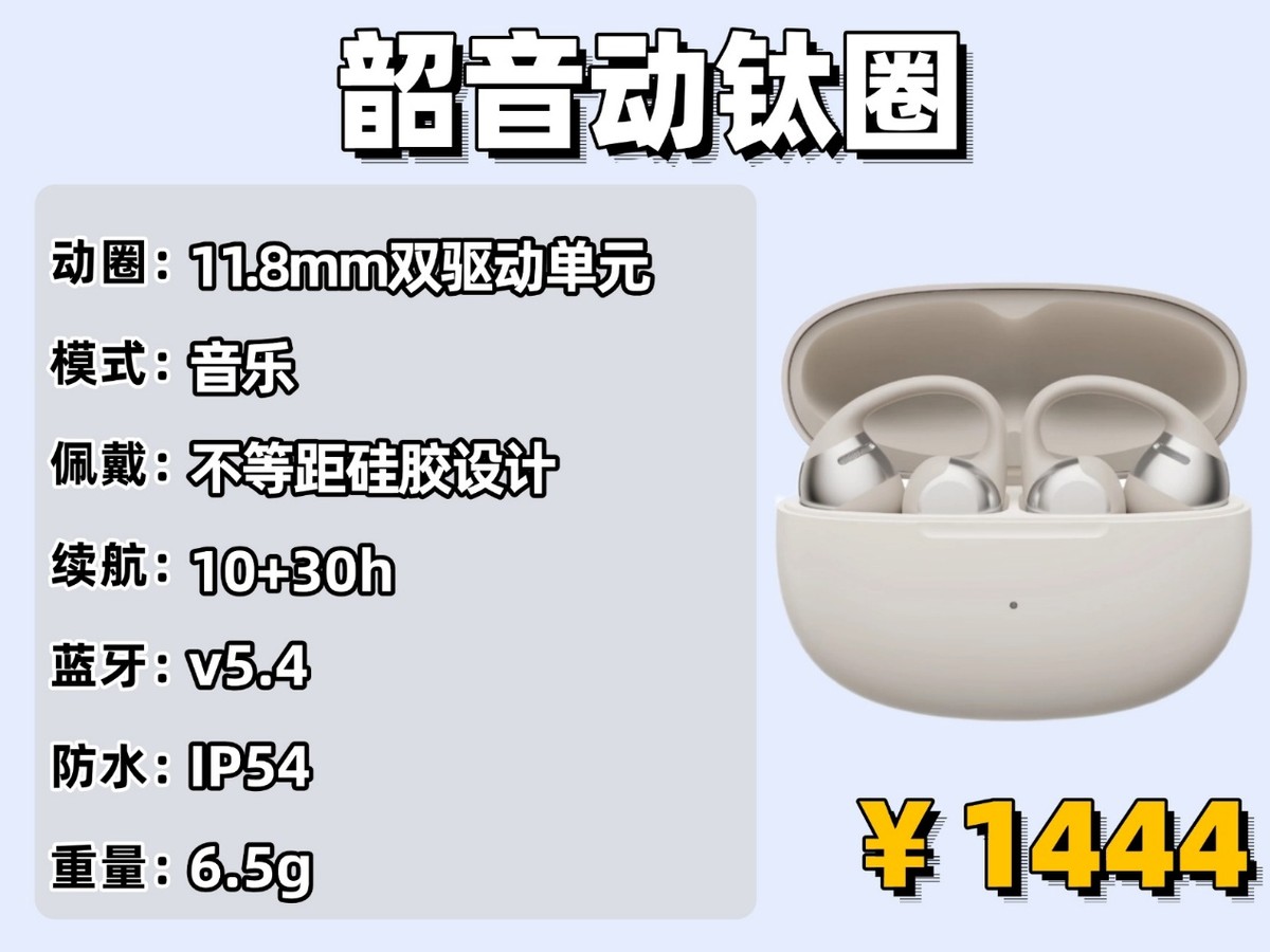 韶音这款出来真的可以说是千元耳机当中的好手!作为首款单耳双单元的耳夹式耳机,它采用0.19mm超薄钛片与不对称动钛弧结构,单耳6.5克的重量也是挺轻的。钛片与液态硅胶的搭配既保证了柔韧性,又通过不等距加厚设计分散了耳部压力。音质表现还是蛮不错的,双11.8mm内磁驱动单元配合Bassphere低频聚合技术,低频下潜深度达到同价位入耳耳机的水平,鼓点弹性与层次感分明,人声还原自然不刺耳。自研的Shokz OpenBass 2.0+算法对频段进行动态补偿,音量下中高频表现稳定。另外,它还支持单次10小时续航结合充电盒可达40小时使用时长!快充10分钟补电可支撑2小时播放,这对通勤族来说足够应对早晚高峰。IP54防水等级应对日常汗水和雨水完全够用。