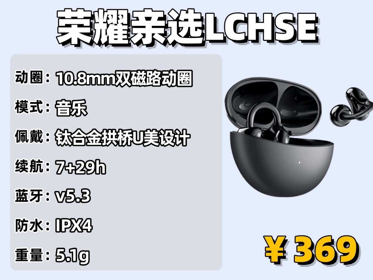 荣耀 LCHSE 耳机是耳夹式设计,单只仅有5.1克重,机身特别轻,戴在耳朵上几乎没什么感觉,它的钛合金拱桥设计很有特点,样子还很漂亮,而且又软又结实。这种材质能适应不同人的耳型,夹力刚好,既戴得稳又不会压得慌,哪怕戴很久,耳朵也不容易酸。音质方面也挺不错,装了 13mm 的大动圈单元和复合振膜,声音清晰、饱满,层次分明。低频部分下潜得深,放节奏感强的音乐时,鼓点又响又有力,听着很带劲。