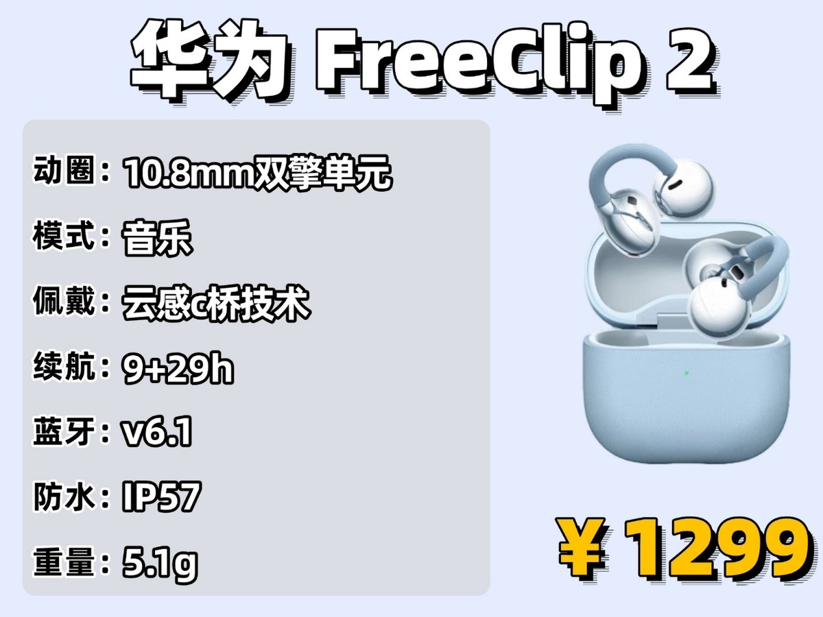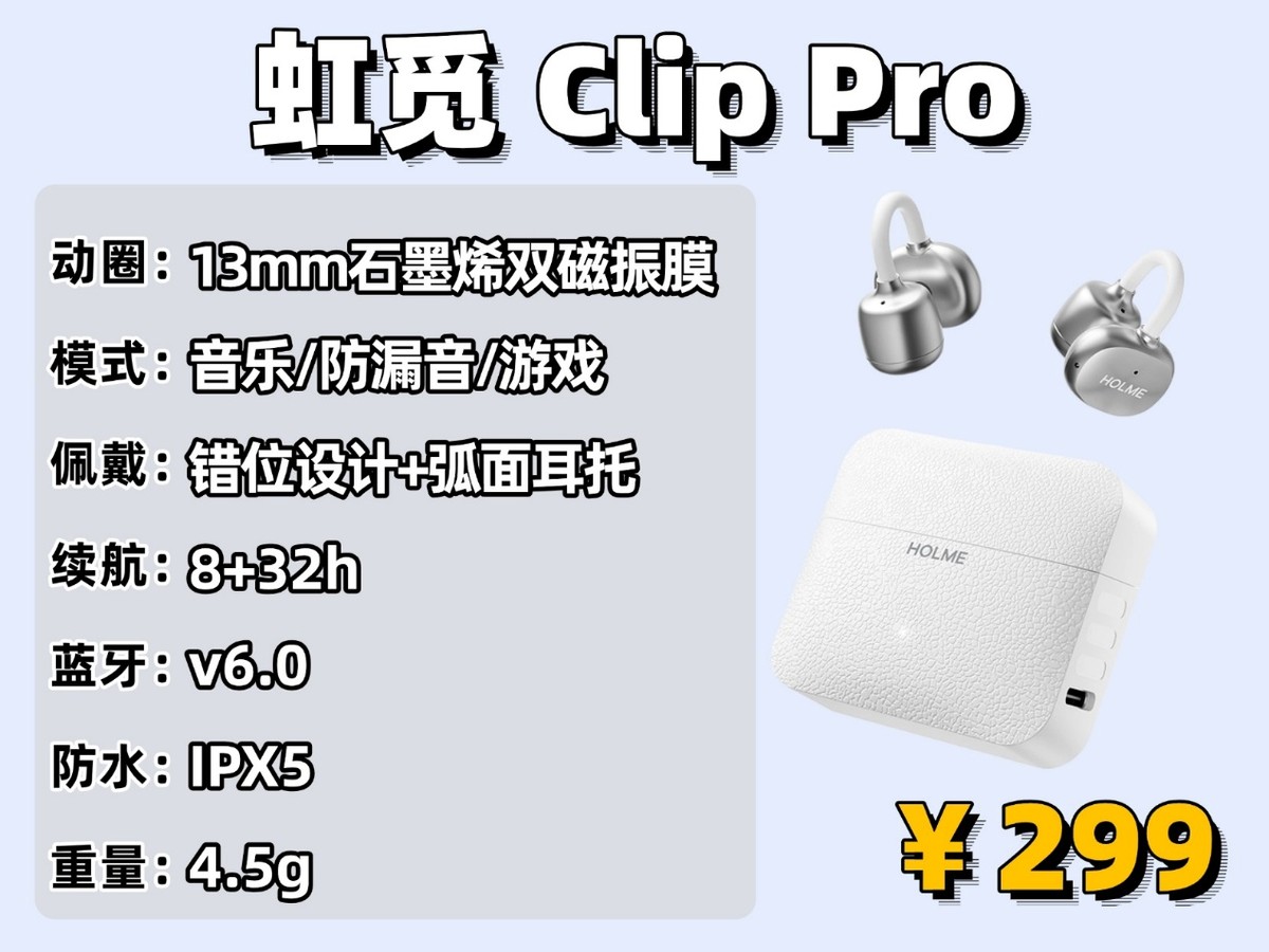 这款耳机在音质方面做了三个重大升级,音质体验能拿来和千元耳机相比。喇叭用的是 13mm 双磁单元,通过两个高精度叠加的磁铁加强磁场,不但可以听的声音更清楚,音量也更够劲;还有气旋式引擎腔体技术,做成了圆柱形的铝合金金属腔体,能有更多的气流,能有更大的劲去推动声音,重低音十分震撼;还有石墨烯科技振膜和虹觅声学实验室的调音配合,音质不易失真,整体音质清晰纯净,表现十分出色!在 500 元内的耳夹式耳机当中,它的音质表现可以说是最好的。佩戴设计特别用心,耳机用了 2.5mm 的错位设计,戴在耳朵上是前高后低的样子,特别贴合耳朵形状,戴着特别稳;还有∠ 12° 的弧面耳托能给耳朵提供合理支撑,把耳机电池和耳朵接触的地方做成了弧形,能贴紧耳背,舒适度又上了一个台阶;单个耳机才 4.5 克,就算戴好久,耳朵也没啥负担,完全不会有压迫感。更重要的是它还搭载了自研的防漏音模式,打开后,基本不会发生漏音的问题,耳机用的是最新的蓝牙 6.0 芯片,连接非常稳定,不容易断连。这款耳机还搭配了四个麦克风,打电话时声音十分清晰。还支持智能一拖二功能,可以同时连接两个设备。还支持 IPX5的防水效果,运动出大汗也不怕!还有游戏模式,玩手游时听声辨位更准确。续航也很给力,单耳能用 8 小时,加上充电仓总共能到 32 小时,这个配置性价比很高。