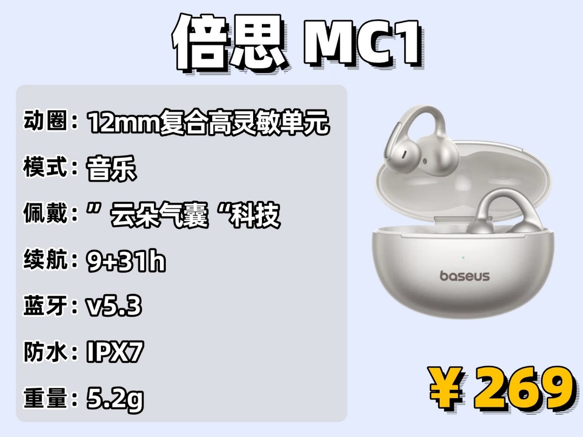 这款算是开放式耳夹耳机里的很火热的一款了,倍思MC1最吸引人的设计就是它的佩戴体验感,它采用的是独家专利的云朵气囊结构,还搭配啦防脱落耳翼和四点支撑设计技术,不但可以巧妙的适配各种耳型,还不会轻易掉落。单耳5.2克的重量再加上不入耳道的设计,平常戴一整天都是可以的。音质方面有首创的空间音效和QQ音乐臻品认证,还靠逆声场消音有效减少了开放式耳机的漏音问题。续航上单次能听9小时,搭配充电仓总续航达40小时。还支持BISA瞬时闪充,IPX7级防水能完美应对运动出汗和小雨。最值得一提的是高配版还接入了豆包、Deepseek等AI大模型,可以进行AI对话、英语陪练这些智能交互,两百多元的价位能拿到这样的配置,真的太强了!