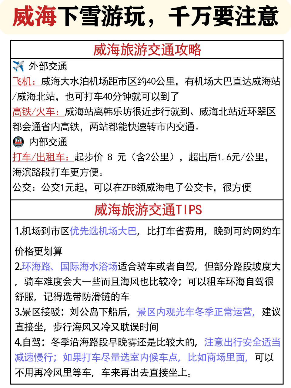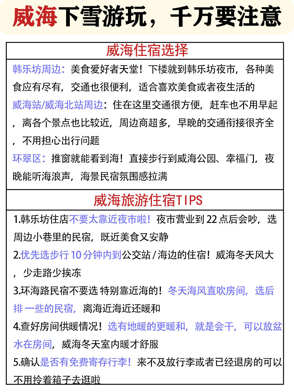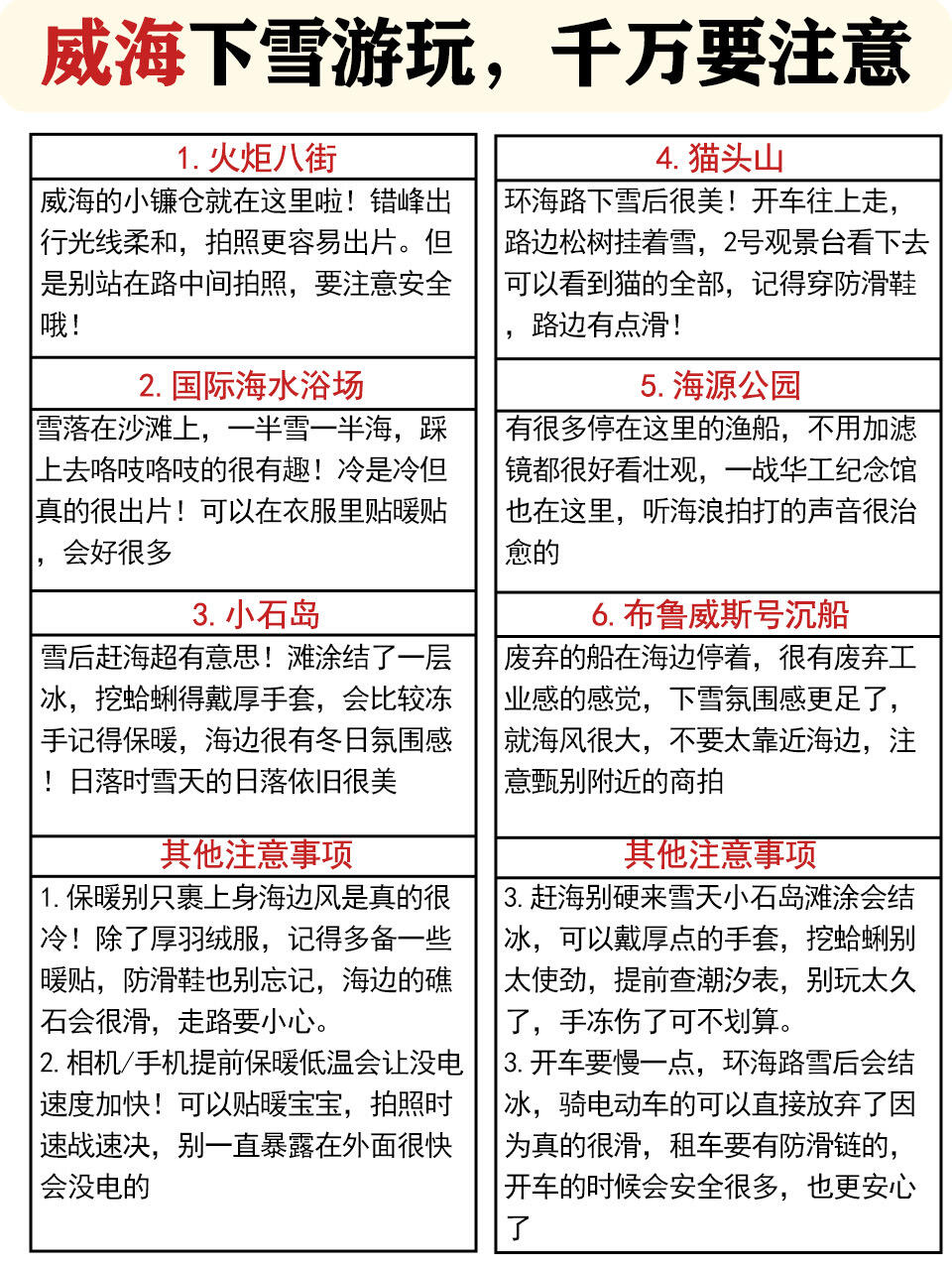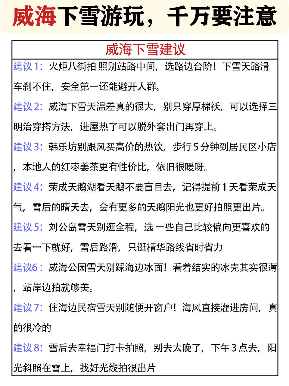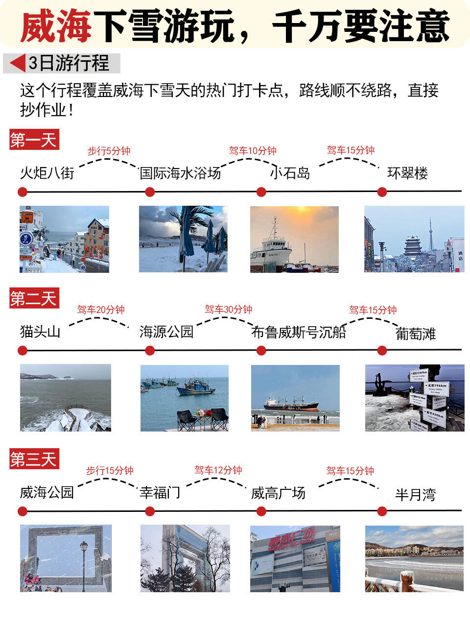 时间和路线安排好不匆忙还玩的好,三天完全够用了✅,就是威海的下雪天真的很冷🥶,记得穿厚点可以多穿点和备点暖宝宝🔥,带一些补水的护肤品💧,海风吹完真的很干呀