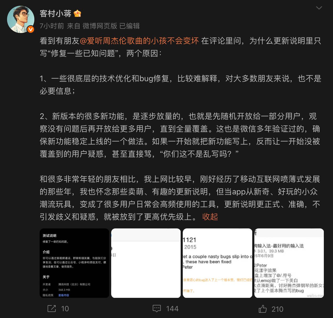 近日,有用户在微博平台提出疑问,称某应用的更新说明仅写“修复一些已知问题”,未详细列出新功能。对此,微博用户“客村小蒋”在公开回复中表示,部分底层技术优化和bug修复较难用简洁语言解释,对大多数用户也非必要信息。