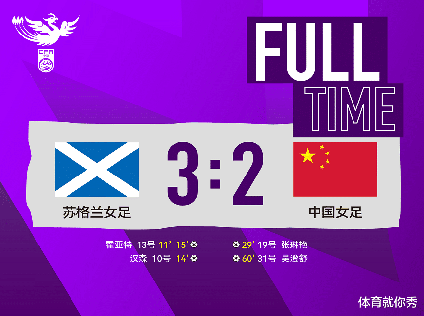可球队防守端的问题依然很大,上一场就被英格兰的前场紧逼,造成了很多的失误,这场比赛的问题依旧还在。第11分钟,中国女足后场出球失误,被对方抢断后,霍亚特直接吊射破门,打破了僵局。第14分钟,苏格兰一次看似威胁并不大的传球,结果中国队后卫盯人不紧,直接给了对手单刀的机会,汉森在禁区内轻松推射破门。仅仅1分钟之后,中国女足中场传球失误,结果被霍亚特再次吊射破门,短短的4分钟之内,中国女足的后防线形同虚设,连续被对手轻松破门,直接就崩盘了!这比赛对于球迷们来说,看着真是憋屈啊,好在第31分钟,中国女足扳回一球,吴澄舒助攻张琳艳扳回一球,上半场中国女足1-3落后,可后防线的问题实在是太大了,真的没法看了!下半场比赛,中国女足被判了点球,好在霍亚特的点球击中了立柱,中国女足逃过一劫,第60分钟张琳艳下底传中助攻吴澄舒破门,中国女足将比分迫近。此后两队也都有改写比分的机会,但都没把握住,最终中国女足客场2-3惜败,遭遇了2连败。