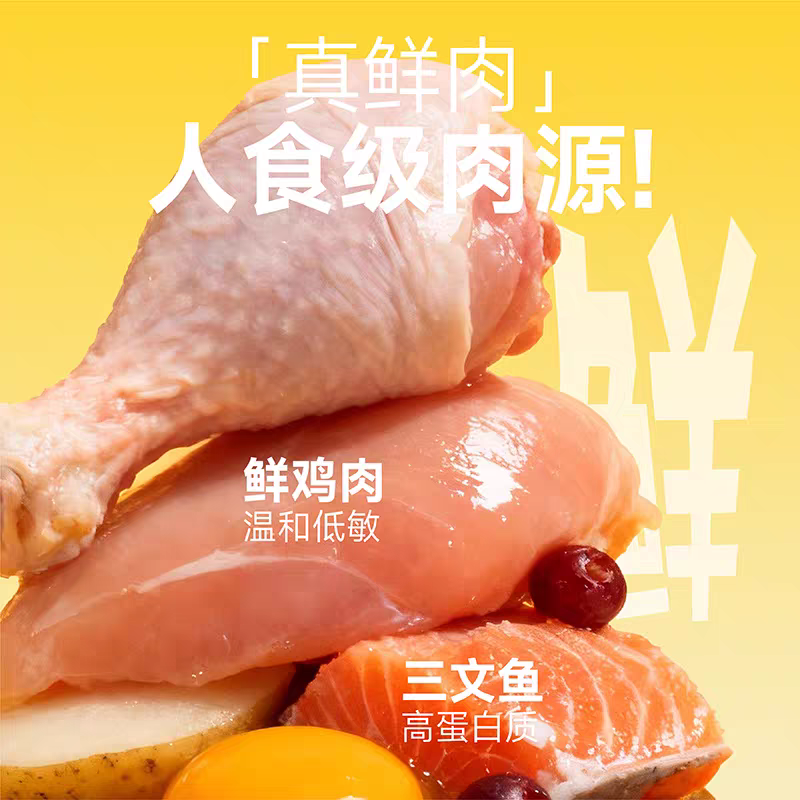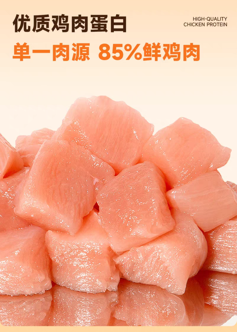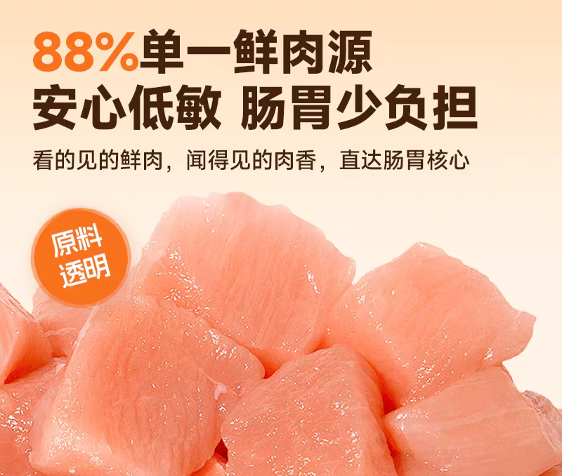 这款猫粮的核心亮点,就是极致的高鲜肉配方。它以新鲜去骨鸡肉为第一原料,鲜肉总含量超过78%,全程没有添加任何植物蛋白来虚标蛋白含量,动物性蛋白占比超过90%,完美贴合猫咪的纯肉食天性。所有肉类原料都有明确的溯源信息,每一批次的原料供应商、检疫报告都清晰可查,拒绝任何来源不明的肉类原料和边角料,从源头保障了猫粮的安全性和营养性。同时,它采用鲜肉酶解工艺,将大分子动物蛋白分解为更容易吸收的小分子肽,既能提升营养吸收率,也能减轻猫咪的肠胃负担,就算是肠胃偏弱的猫咪,也能轻松消化。