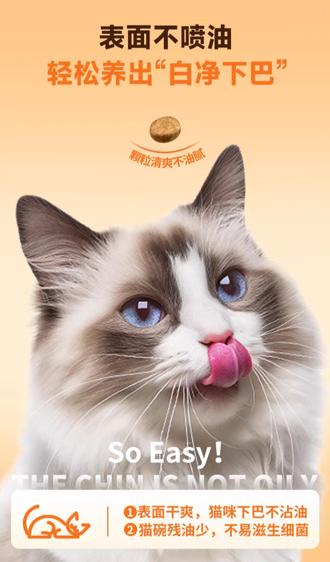 这款猫粮采用90℃低温慢烘工艺,全程低温烘焙4小时以上,相比传统180℃以上的高温膨化工艺,能最大程度保留鲜肉的营养活性和原生风味,营养保留率提升20%以上。更重要的是,它无需在颗粒表面喷涂油脂和人工诱食剂,就能拥有出色的适口性,颗粒表面干爽不油腻,残油率极低,从根源上减少了猫咪黑下巴的发生概率,对容易出油、有黑下巴困扰的猫咪格外友好。原料方面,它以新鲜鸭肉和鸡肉为主要原料,鲜肉总含量超过80%,没有添加任何谷物、肉粉、人工添加剂,配方干净纯粹,低敏友好。